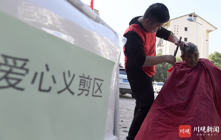 志愿者为老人义务理发。