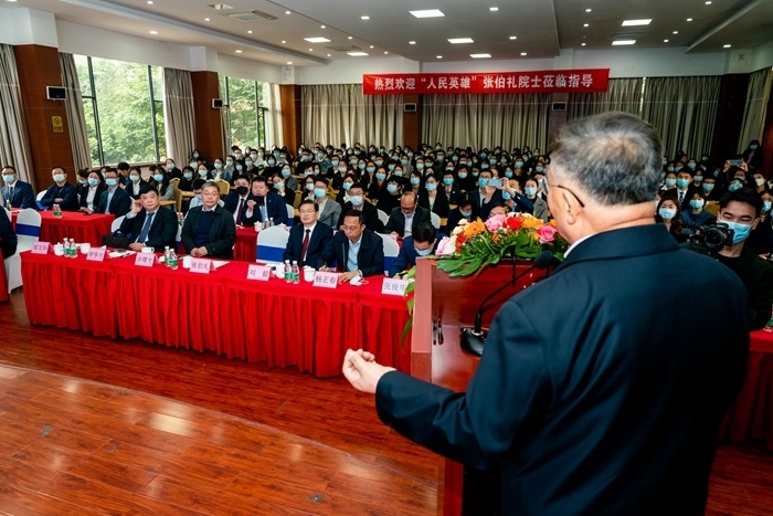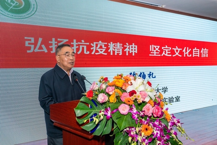 成都中医药大学党委书记刘毅代表学校向张伯礼院士赠送纪念品,并在讲话中总结到,张伯礼院士是最早采用中医干预的专家之一,在没有特效药抗拒病毒的情况下,主张中西医互补救治患者,经过临床取得显著疗效后,其疗方编入国家第七版新冠肺炎诊疗方案里,参与我国开设的“全球疫情会诊室”,分享了抗击新冠肺炎“中国方案”,让世界上更多的患者从中受益,是当之无愧的“人民英雄”。