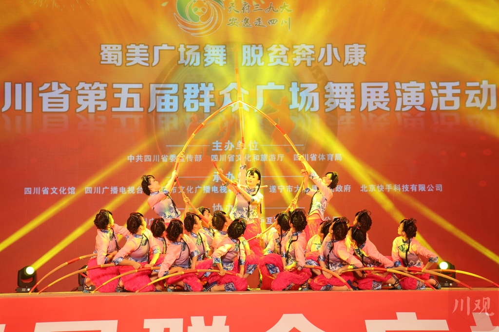 蜀美广场舞,脱贫奔小康。10月23日,四川省第五届群众广场舞展演活动在遂宁大英落幕,共有来自全省21个市州的22支队伍参赛。本次活动由省委宣传部、文化和旅游厅、省体育局主办,邀请重庆优秀群众广场舞作品参与展演,实现川渝同台共舞。活动主要采取“现场+线下”观看模式,观众可通过“快手”“智游天府”平台和主办单位官方新媒体矩阵,在线观看参赛作品线上展播和展演现场网络直播。