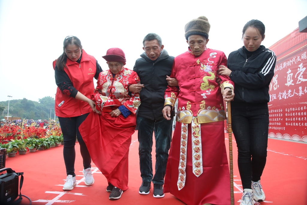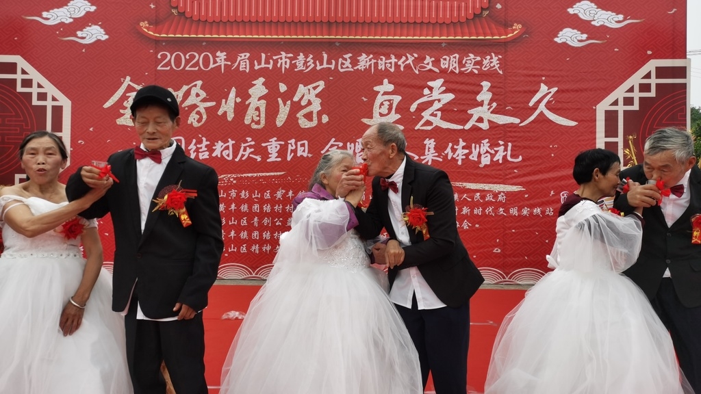“以前哪儿有这些哦,现在日子好了,党和政府也关心我们,我们才能有这个机会补办婚礼。”10月25日,重阳节当天,四川省眉山市彭山区黄丰镇团结村组织开展“庆重阳”金婚老人集体婚礼,50对金婚、钻石婚老人穿上礼服,举行集体婚礼,他们的平均年龄达到83岁,今年102岁的向玉珍婆婆和99岁的吕从安爷爷穿上婚纱,牵着手高兴的说道。
