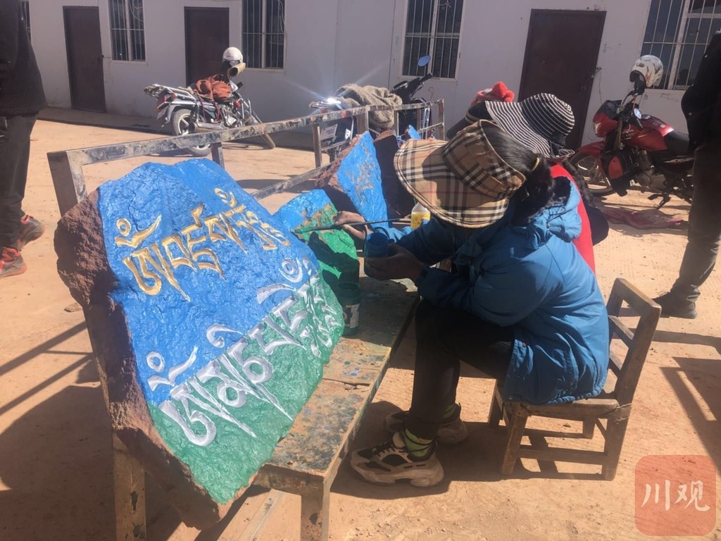 距离合作社两公里开外,有一座千年的朝拜圣地——松格嘛呢石经城,人们都有在石经城摆放有吉祥寓意的石刻。石刻,则是阿日扎镇传承千年的手艺。