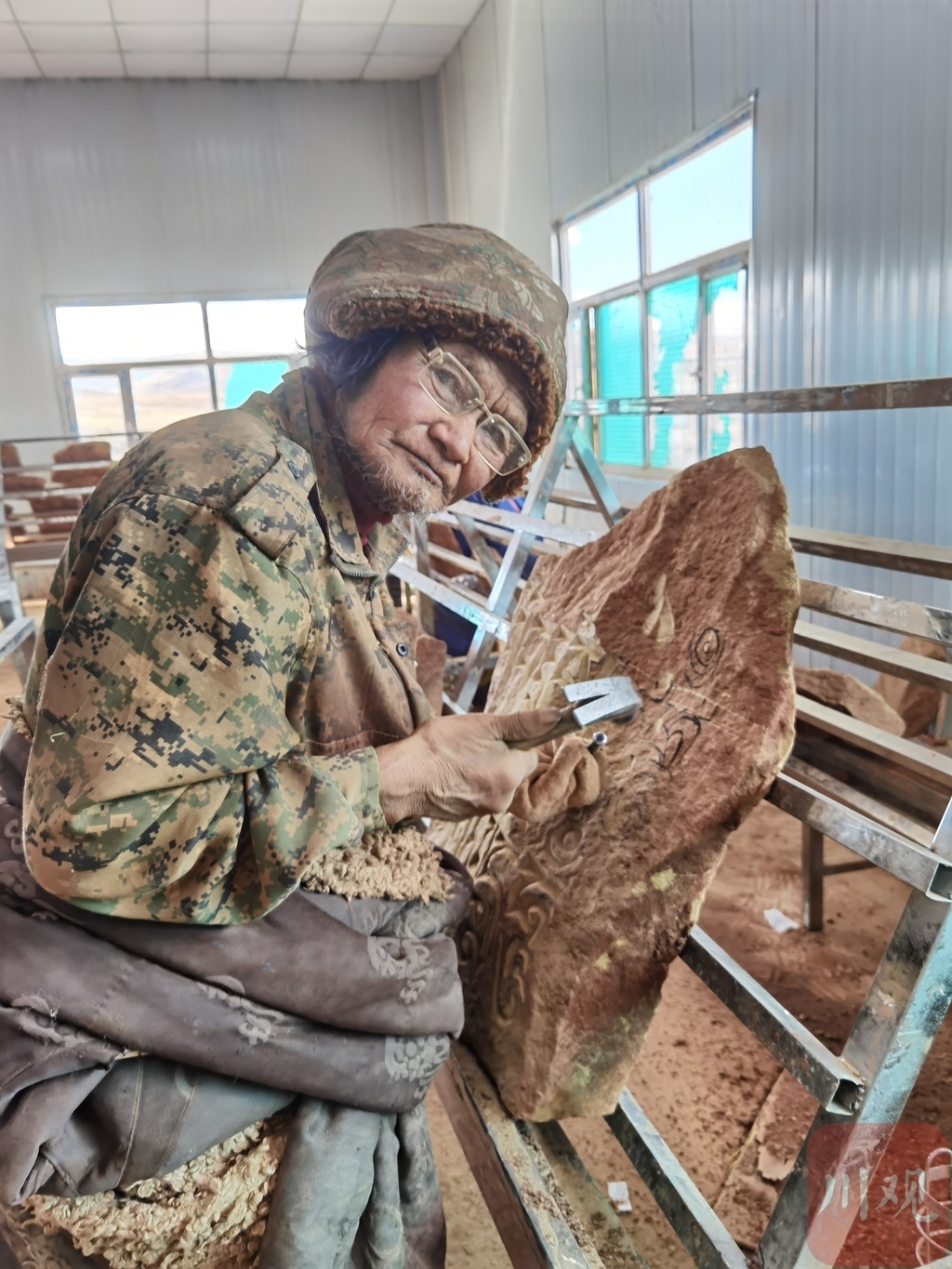 今年秋天的扎溪卡草原,天高云低,格外清朗。在松格嘛呢石刻合作社生产车间,石刻匠人冲花拿着雕刻工具在一块石材上雕刻经文。