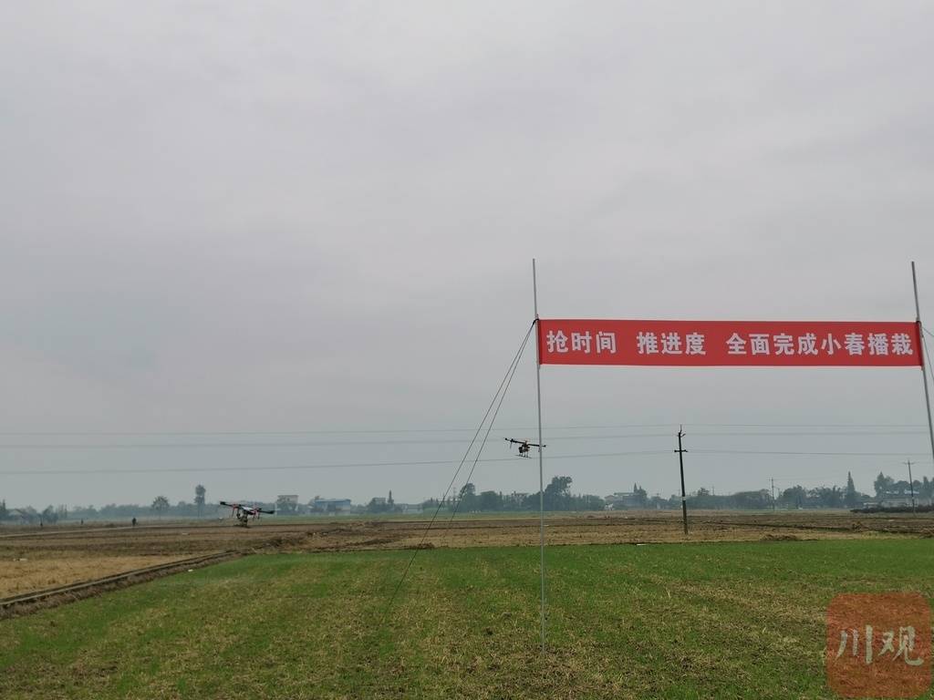 10月27日,绵阳市安州区秀水镇的优质粮油现代农业园区内,两台无人机像两只大鸟,在半空中来回盘旋,飞播油菜。