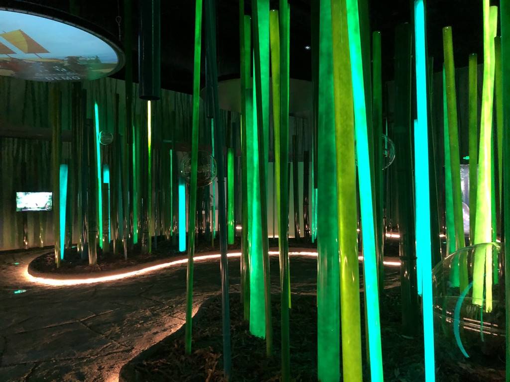 第二个展馆的主题是竹林隐士,展厅中布满艺术化的竹林,其中放置着大熊猫伴生动物标本,顶部的投影可以根据游客到达区域依次亮起,介绍熊猫相关故事。这个展厅中的人机互动小游戏“大熊猫每天要吃多少竹子?”,应该会受到不少前来观览的孩子的喜爱。