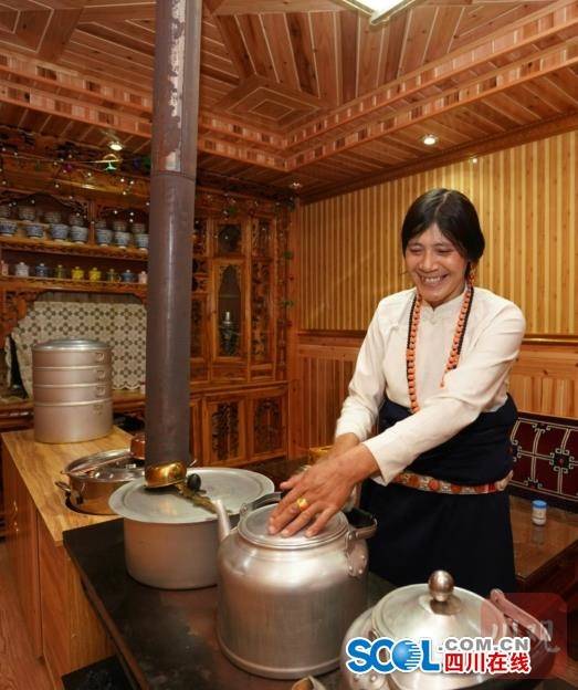 80多平米的住房摇身一变,成了一座极有藏族特色的民宿。走进房间,电视、冰箱、抽油烟机等家电一应俱全;客厅摆着一套木质的藏式柜子,里面放着精致的餐具和茶杯;一长溜藏族特色的传统桌床,铺着色彩鲜艳的羊毛氆氇;茶几上放着黄澄澄的糕点盒子,被玛基擦拭得一尘不染。