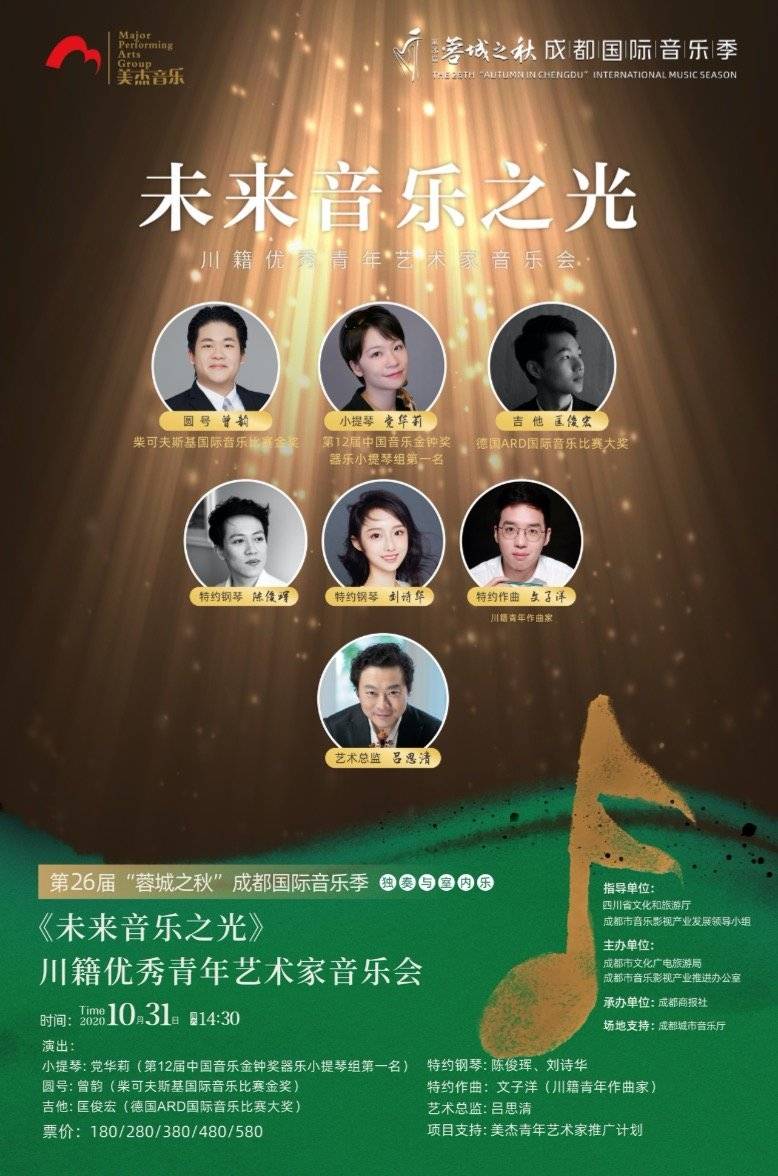 今年,“蓉城之秋”加强了对优秀青年音乐人才的支持,和名师名家与青年音乐人的互动,专门引进由知名古典音乐经纪公司“美杰音乐”与国际著名小提琴大师吕思清先生联合发起的“美杰青年艺术家推广计划”,而“未来音乐之光——川籍优秀青年艺术家音乐会”正是该推广计划的一部分。