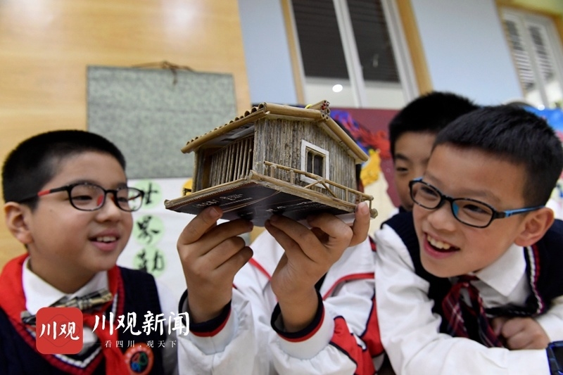 10月29日,在四川省成都市树德小学,小学生展示利用废旧的木棍、牛奶盒等制作出来的小木屋。