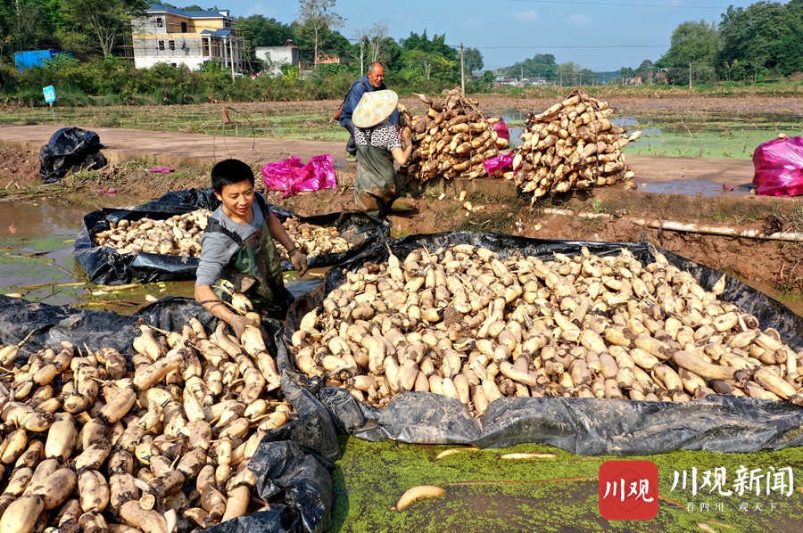 仁寿县怀仁街道利林社区种植户正在搬运刚采收的莲藕。