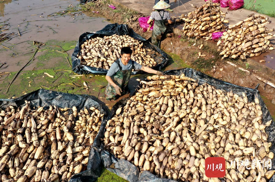 10月29日,仁寿县怀仁街道利林社区扶贫基地的1100多亩莲藕迎来丰收季,当地种植户正抢抓农时采收。在产业扶贫中,当地采取“支部+基地+贫困户”模式,集中发展生态莲藕,亩产值达8000多元,帮助贫困群众实现脱贫和稳步增收。