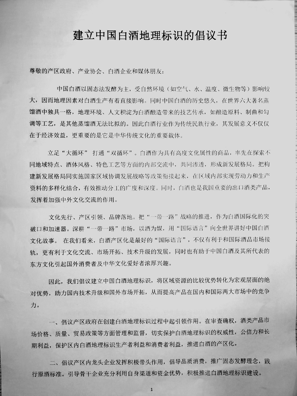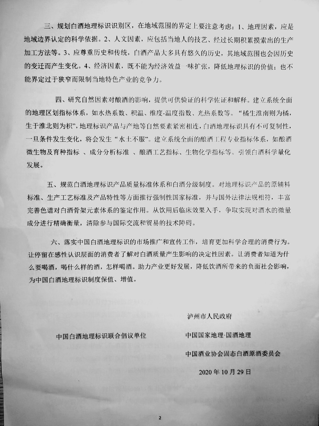 “我们倡议建立中国白酒地理标识。”10月29日,泸州市人民政府、中国国家地理·国酒地理、中国酒业协会固态白酒原酒委员会三方联合,发布《建立中国白酒地理标识的倡议书》。