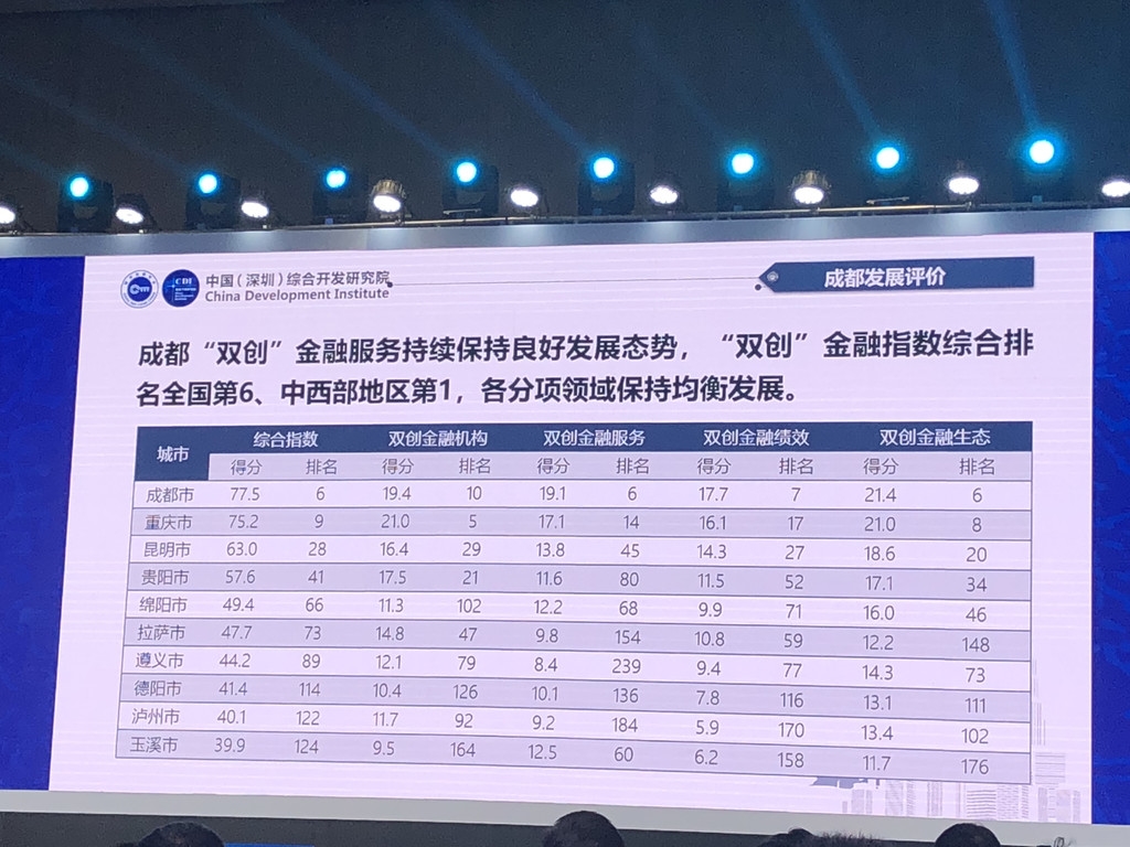 “成都‘双创’金融指数综合排名全国第六,在十五个副省级城市中排名第四位,中西部地区排名第一,各项指标均进入全国前十。”10月30日,中国(深圳)综合开发研究院在成都发布“2020·中国双创金融指数(CIEFI)”。