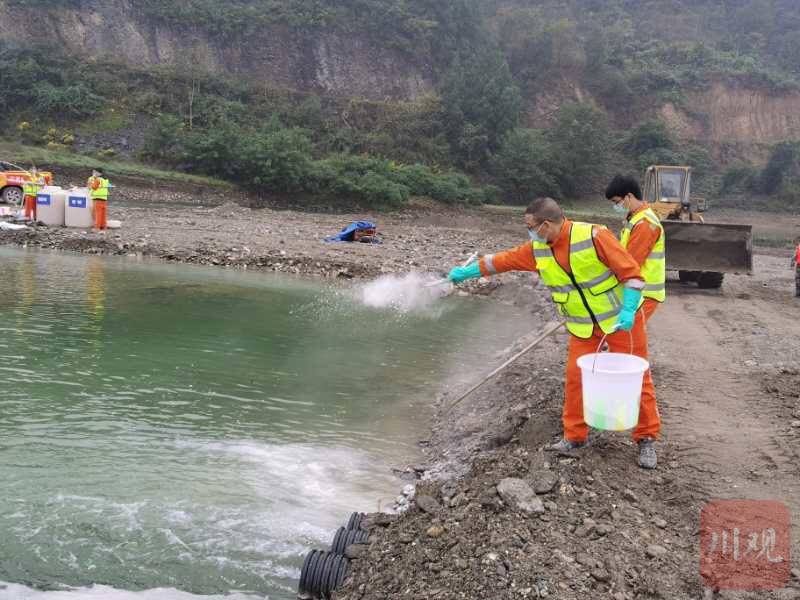 在三道围堰处,挖掘机、推土机修筑围堰,人工扛运沙袋垒砌加固;两岸设置喷淋装置投放絮凝剂和净水剂,冲锋舟在围堰塘时刻保障施工人员安全,医疗救护人员现场做好人员救护准备,无人机在围堰上空随时观测应急处置情况,各应急处置队伍应急处置工作有序开展……