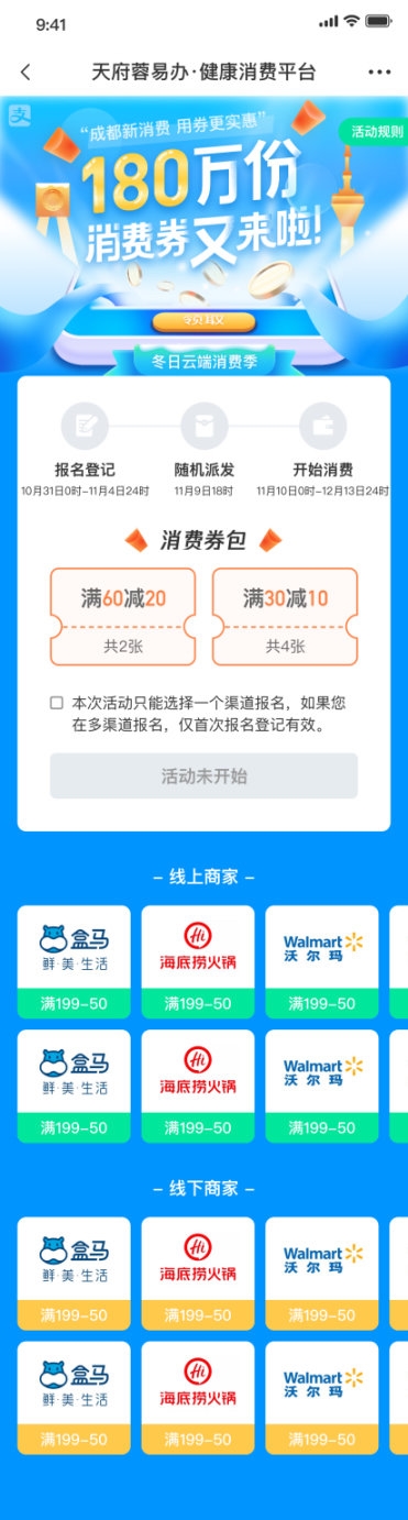 在哪些线上平台可以使用消费券?在目前已报名的平台中,支付宝用户可在盒马鲜生、淘票票、饿了么、口碑、飞猪等线上平台选择参与活动的商户使用消费券;微信及云闪付用户可在伊藤到家、伊藤全球购、成都苏宁广场、华润万家生活超市、步步高超市、家乐福、沃尔玛、人人乐、时代百盛、茂业仁和春天光华店等商超的线上平台(微信小程序或自开发APP)使用消费券,并均可与平台促销优惠叠加享受!除此之外,据了解,还有更多线上平台正在筹备中,有更多惊喜值得期待。