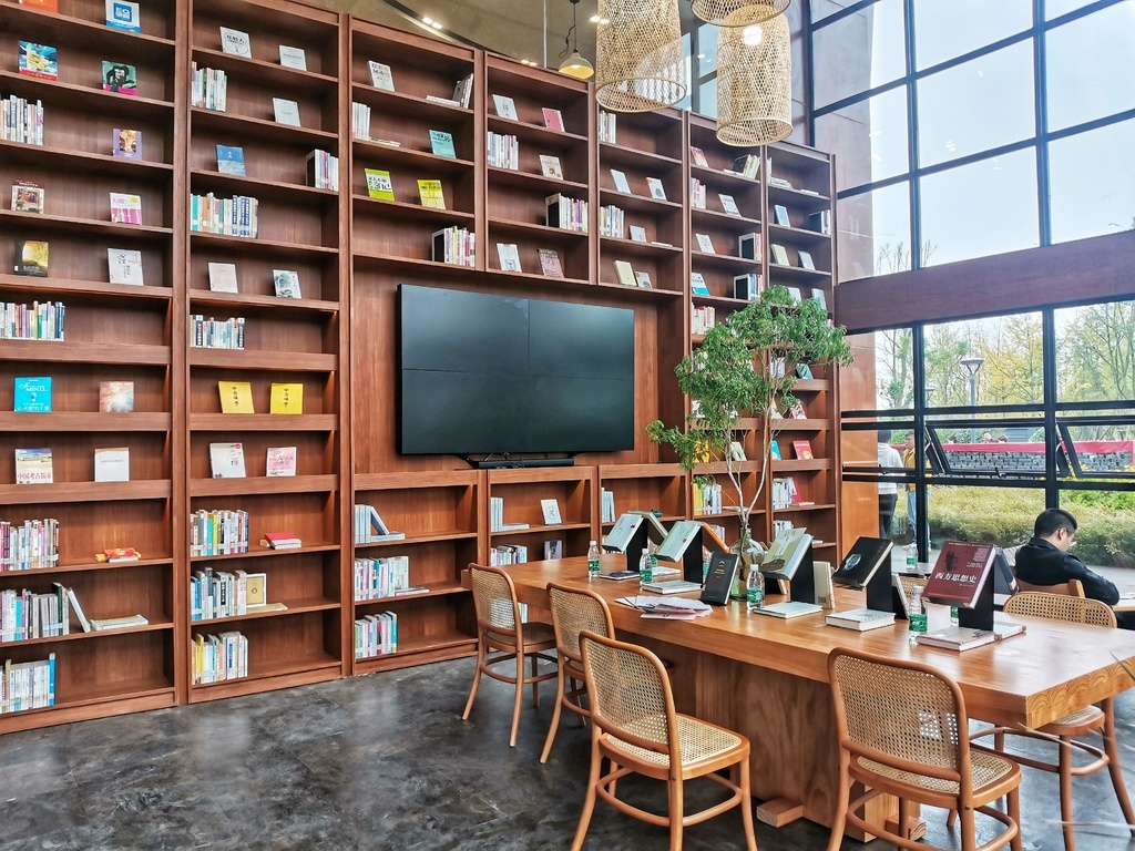 作为四川省图书馆在国内打造的首个“馆、店”融合新模式空间,馆里·鹿溪智谷分馆坐落于天府新区。近年来,天府新区致力于探索公园城市的智慧表达,加快促进公园城市生态价值、人文价值、经济价值、生活价值的转化,营造多元价值场景。“新”上线的馆里·鹿溪智谷分馆是践行“公共图书馆+旅游地标”文旅深度融合发展策略的成果,集文化与科技于一体。除具备传统借阅服务和典藏整理功能外,还可提供数字化及远程服务。门口处,智能问答机器人可以与读者互动,解疑答惑。更多尖端科技隐藏其中,让读者感受智能化阅读服务的乐趣。四川省图书馆馆长何光伦介绍,依托四川省图书馆丰富的馆藏资源,馆里·鹿溪智谷分馆拥有近万册的藏书,为读者打造诗意的公共阅读空间。