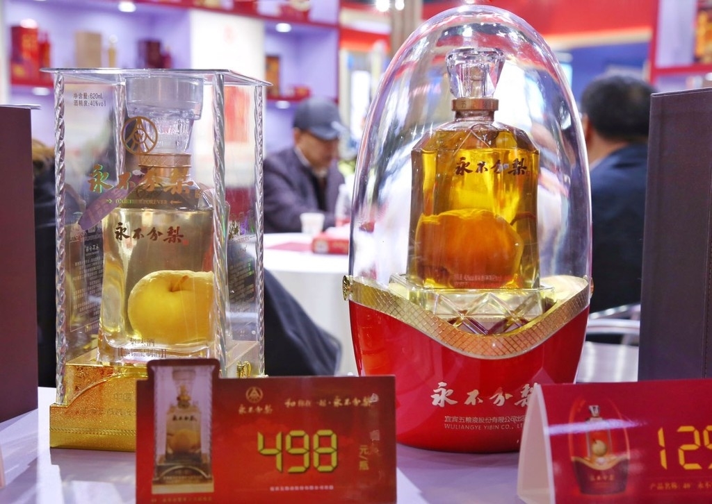 除了品牌名让人耳目一新,瓶中“料”也是看点之一。记者在邯郸永不分梨酒业股份有限公司的展厅外看到,展台上陈列的白酒,瓶中都有梨子,价位从498元到1298元不等,不少群众弯腰一探瓶中究竟。