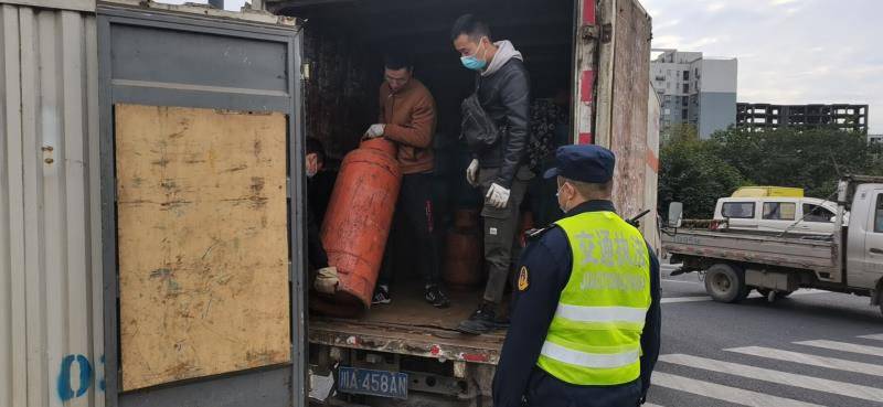 同日下午16时,接交警部门通报,在金牛区金芙蓉大道有一辆普通厢式货车,违规运载有大量液化气罐。为尽快消除安全隐患,执法总队立即抽调执法人员前往现场。16时15分,执法人员到达现场并开展检查,通过现场清点,该车车内共装载70个液化气罐。经查,当事车辆性质为普通货物运输车辆,涉嫌未取得道路危险货物运输许可擅自从事道路危险货物运输。为确保液化气罐安全处置,现场执法人员迅速协调合法危货运输车辆完成了液化气罐转运,有效消除了一起安全隐患。