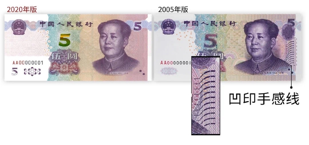 2020年版第五套人民币5元纸币保持2005年版第五套人民币5元纸币规格、主图案、主色调、“中国人民银行”行名、国徽、盲文面额标记、汉语拼音行名、民族文字等要素不变,优化了票面结构层次与效果,提升了整体防伪性能。