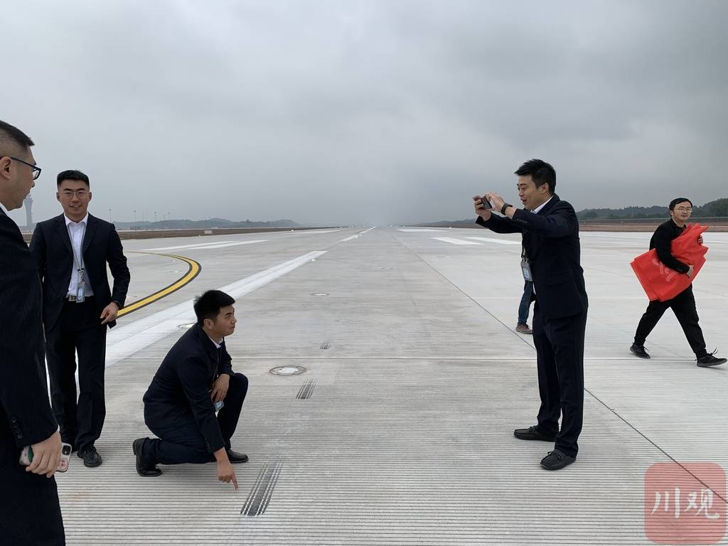 校验飞机落地后,在现场的天府机场建设者、运筹者以及空管人员激动地上前,与天府机场历史上第一道飞机轮胎印记合影。