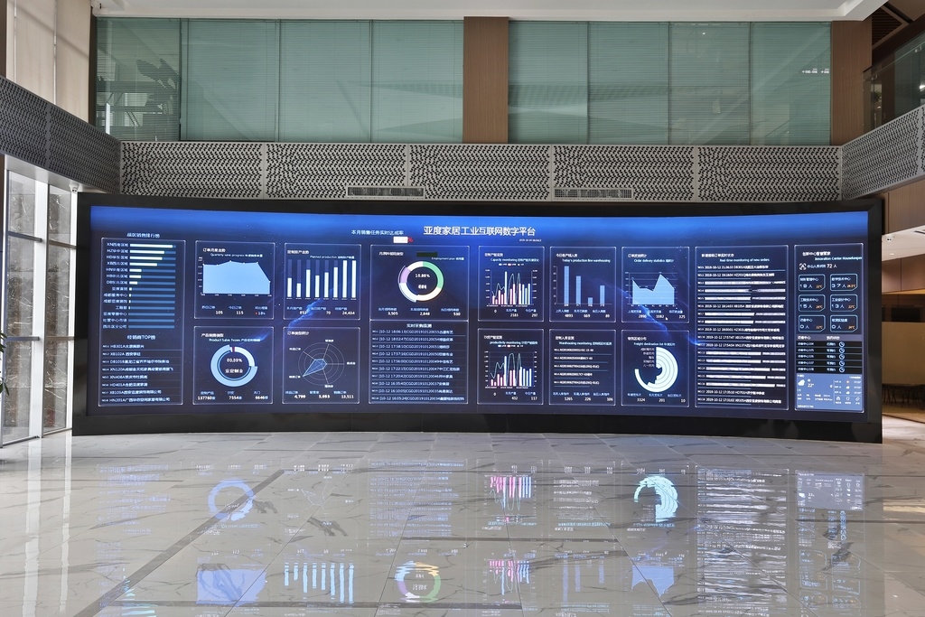 10月20日,亚度家具办公楼一楼大厅内,一块大屏幕上的数据不停闪烁:“加工中心封边机正在生产邓先生定制厨房橱柜、客厅卡座、次卧床……”“原材料库存饱和开起黄色预警”“定制产线工人陈孟琳待加工任务数为18件”……