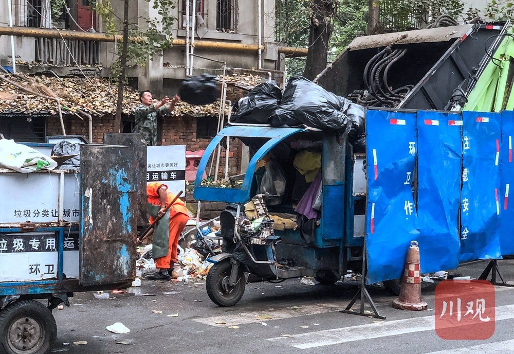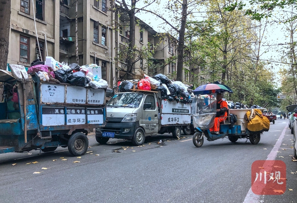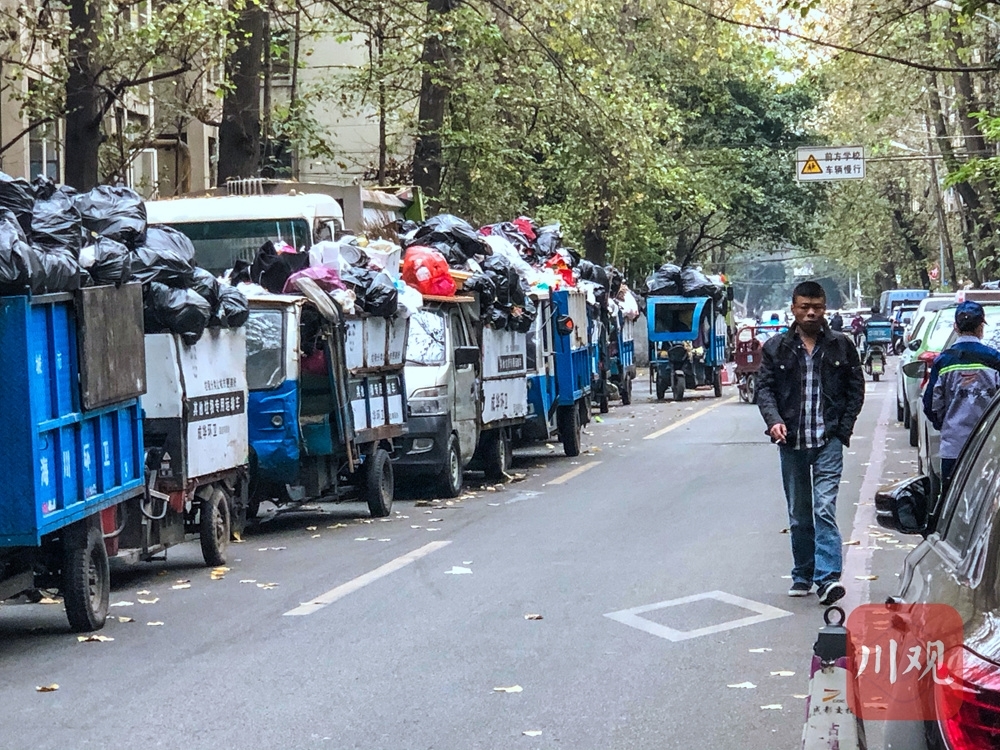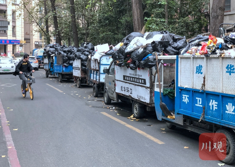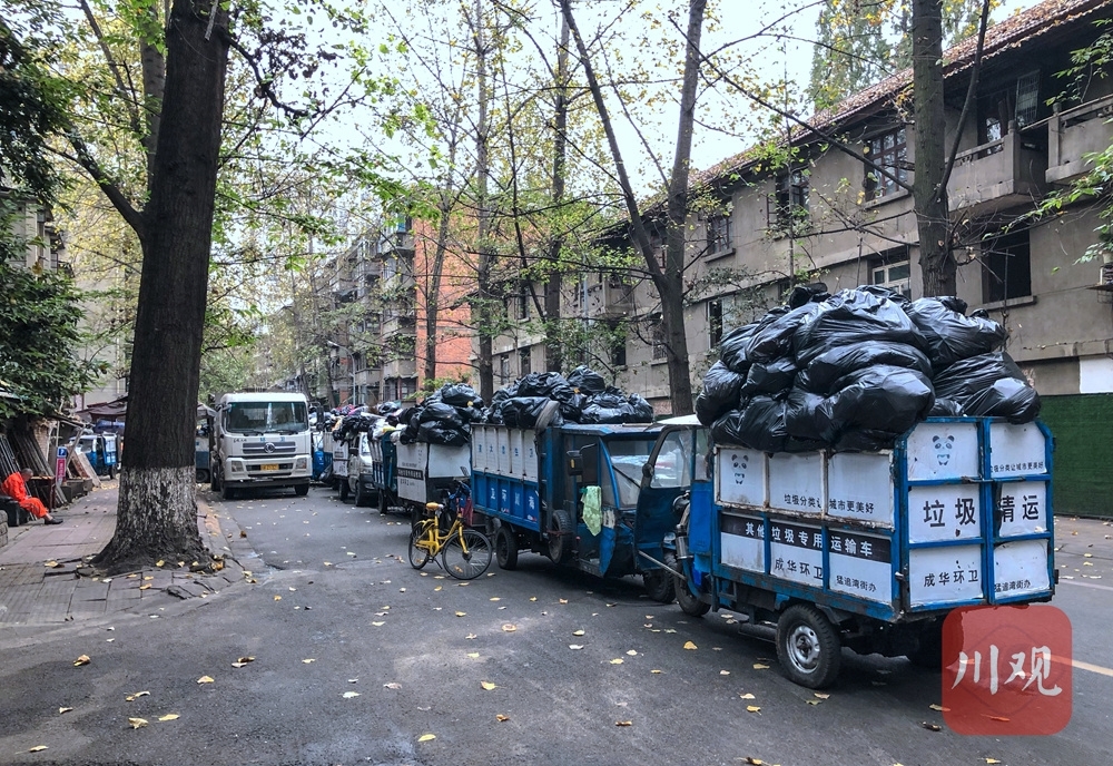 1日下午5时许,四川在线记者前往现场一探究竟。从猛追湾街右拐进入猛追湾横街,一辆洒水车后面,一排垃圾清运的三轮车赫然在目。记者数了一下,现场停着12辆写有“成华环卫”的垃圾清运车,每辆车都堆着满满的垃圾。就在记者采访的半个小时内,还不断有环卫工骑着装满垃圾的垃圾清运车来到这里。
