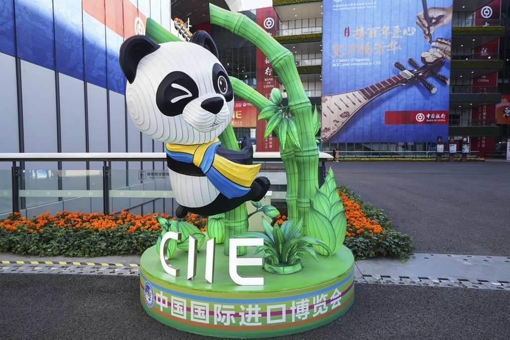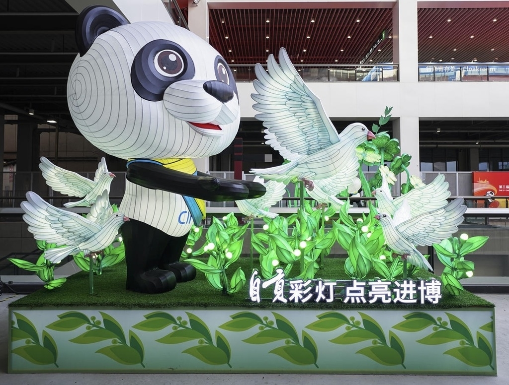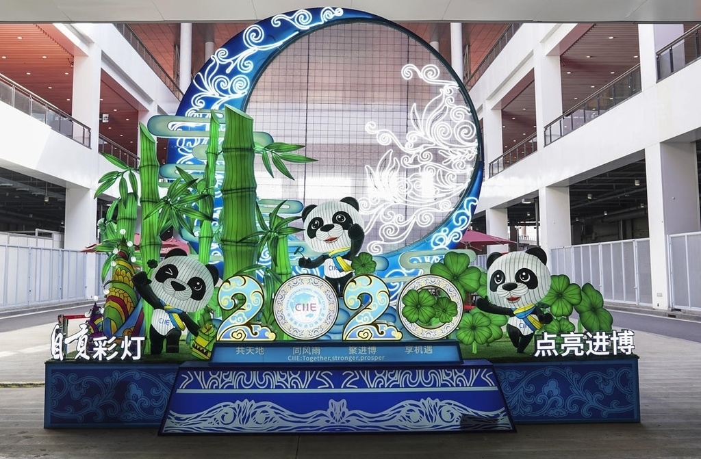 11月3日在国家会展中心(上海)拍摄的彩灯。第三届中国国际进口博览会现场的多处彩灯为展会增添了色彩与魅力。新华社记者 张豪夫 摄