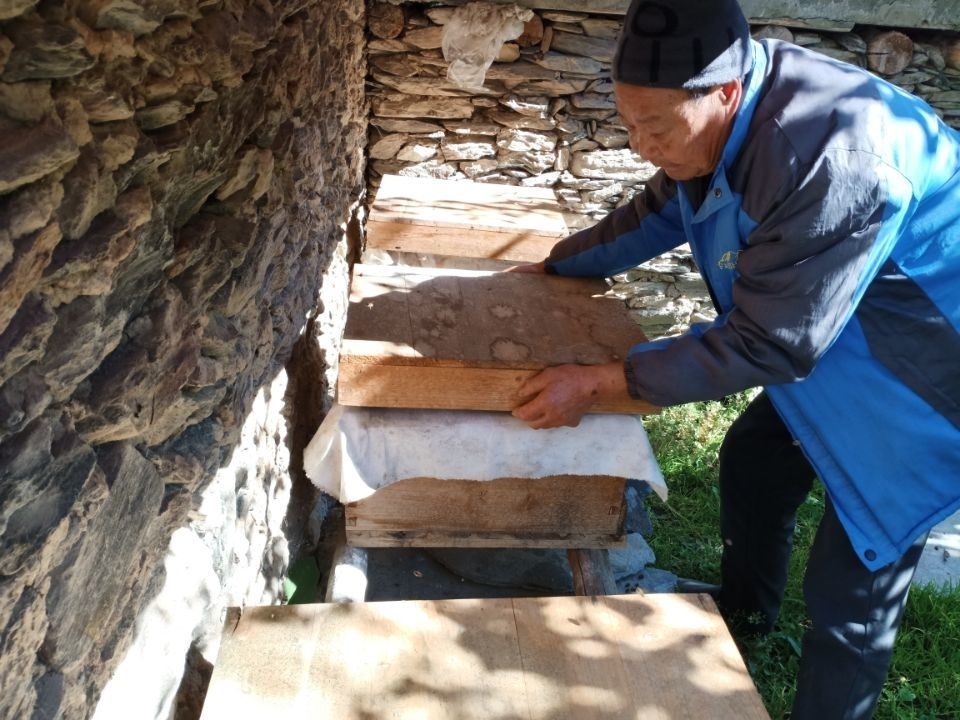1公斤白糖,0.3公斤蜂糖,1.5公斤水,称好,勾兑。11月3日中午,在强烈阳光下,茂县黑虎镇耕读百吉村贫困户张朝斌佝偻着身子,艰难地给7箱蜜蜂备食。