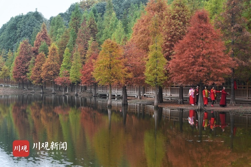 11月4日,德阳市东湖山公园水杉林已逐渐泛黄变红,远远望去,犹如一幅浑然天成的彩色油画,吸引着众多游人慕名而来。