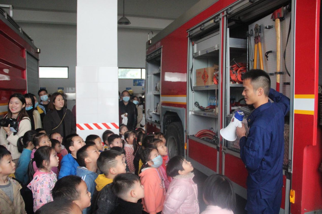 “好大好高呀,我们自己上不去。”一进消防大院,萌娃们就被眼前的6辆消防车吸引了。他们平时只看过消防车的外观,从来没有这么近的观察过它。在消防员的介绍下,小朋友们了解了这些“大家伙”的不同用途和使用方法。