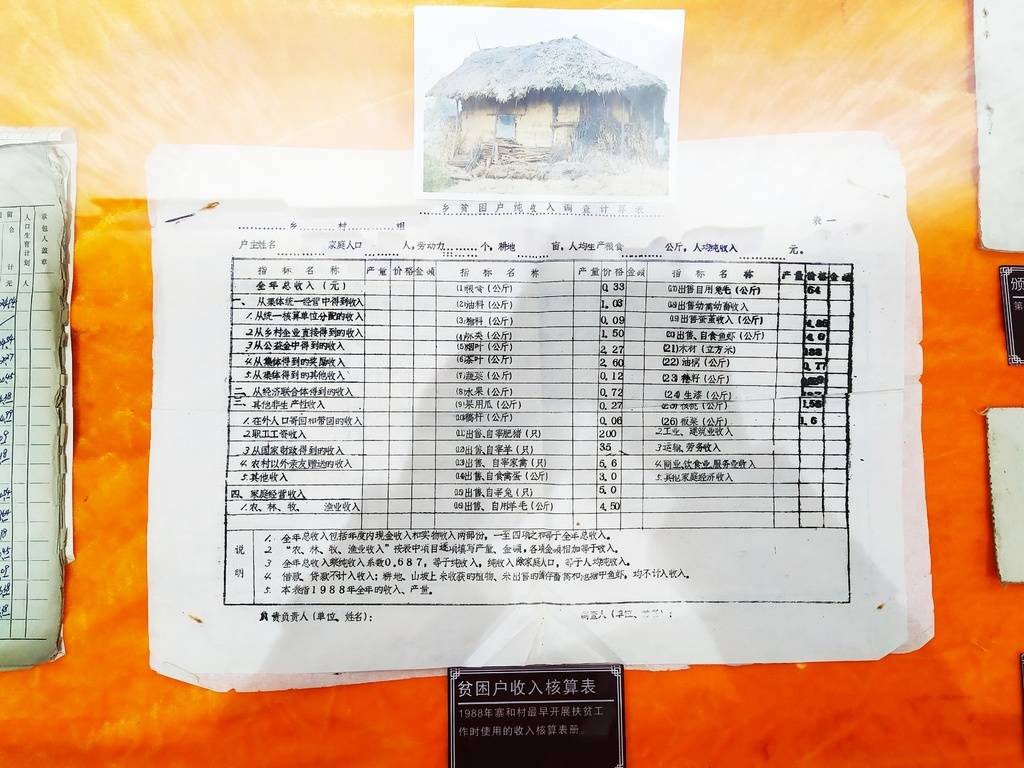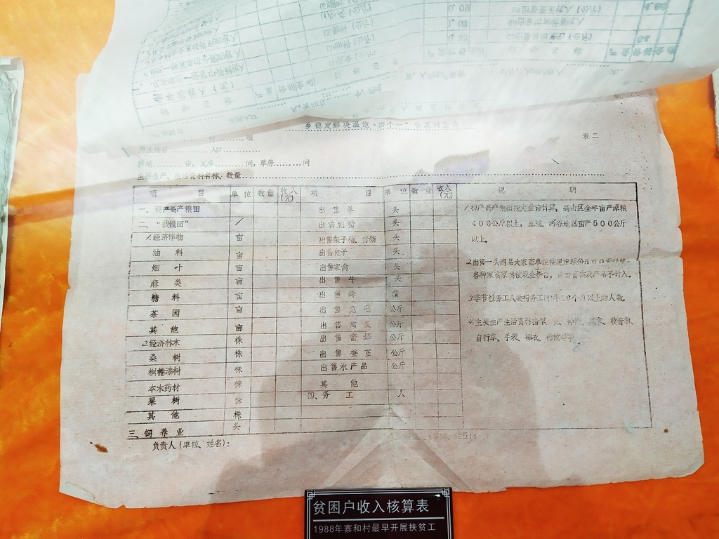 11月3日,在叙永县麻城镇寨和村史馆,一份1988年开展扶贫工作时的《乡贫困户收入调查计算表》《乡稳定解决温饱“四个一”情况调查表》引起了记者注意。