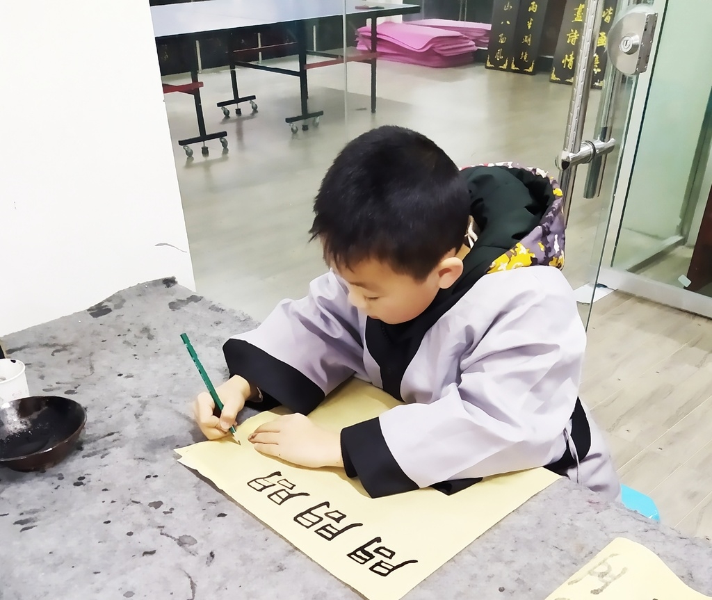 安置小区学生在国学馆学习书法