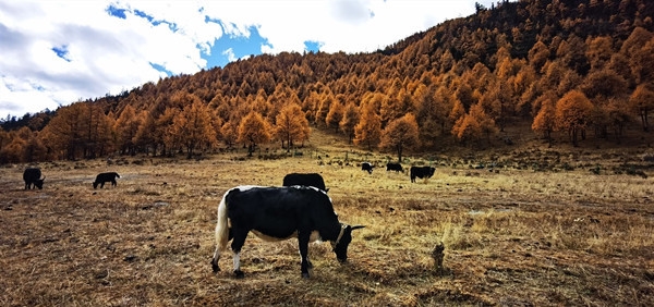 此时此刻,雅安宝兴县硗碛藏乡,各色彩叶在山间错落展开,远近高低、层林尽染。