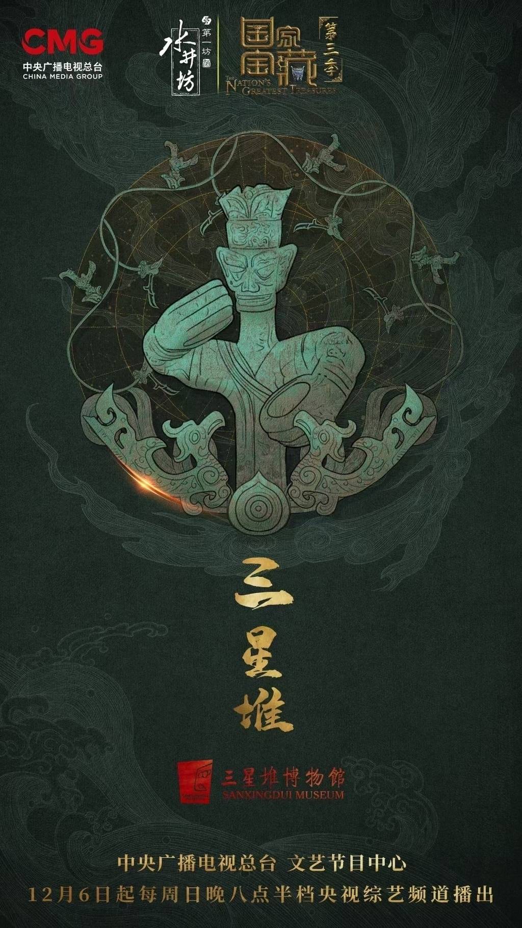 11月5日晚7点,广汉三星堆博物馆在官方微博发布《国家宝藏》第三季定档宣传海报,其中,三星堆博物馆镇馆之宝青铜大立人像位居海报正中。
