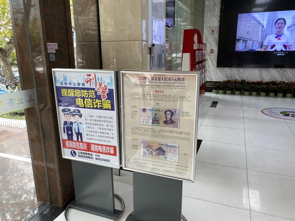 刚记者刚提问完“2020年版第五套人民币5元纸币和老版有何不同?”时,工商银行春熙支行的工作人员便拿出了一份宣传手册向记者耐心解答,而在营业厅入口处也贴着清晰易懂的展示牌。