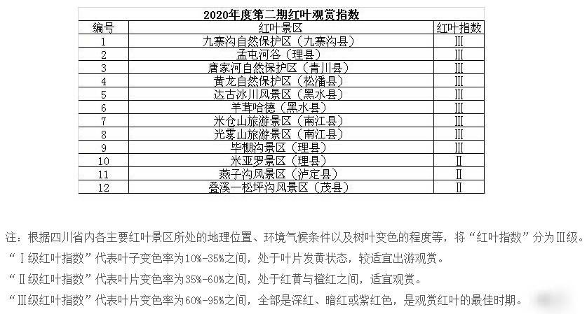 根据四川省林业和草原局发布的四川省2020年度第二期红叶观赏指数。本周末,九寨沟自然保护区、唐家河自然保护区、理县孟屯河谷、黄龙自然保护区、达古冰川风景区等将进入最佳观赏时期。