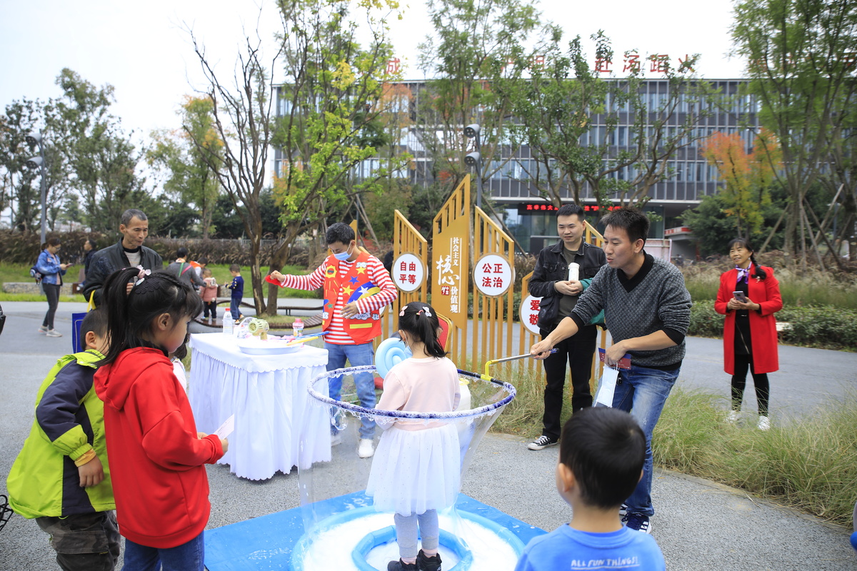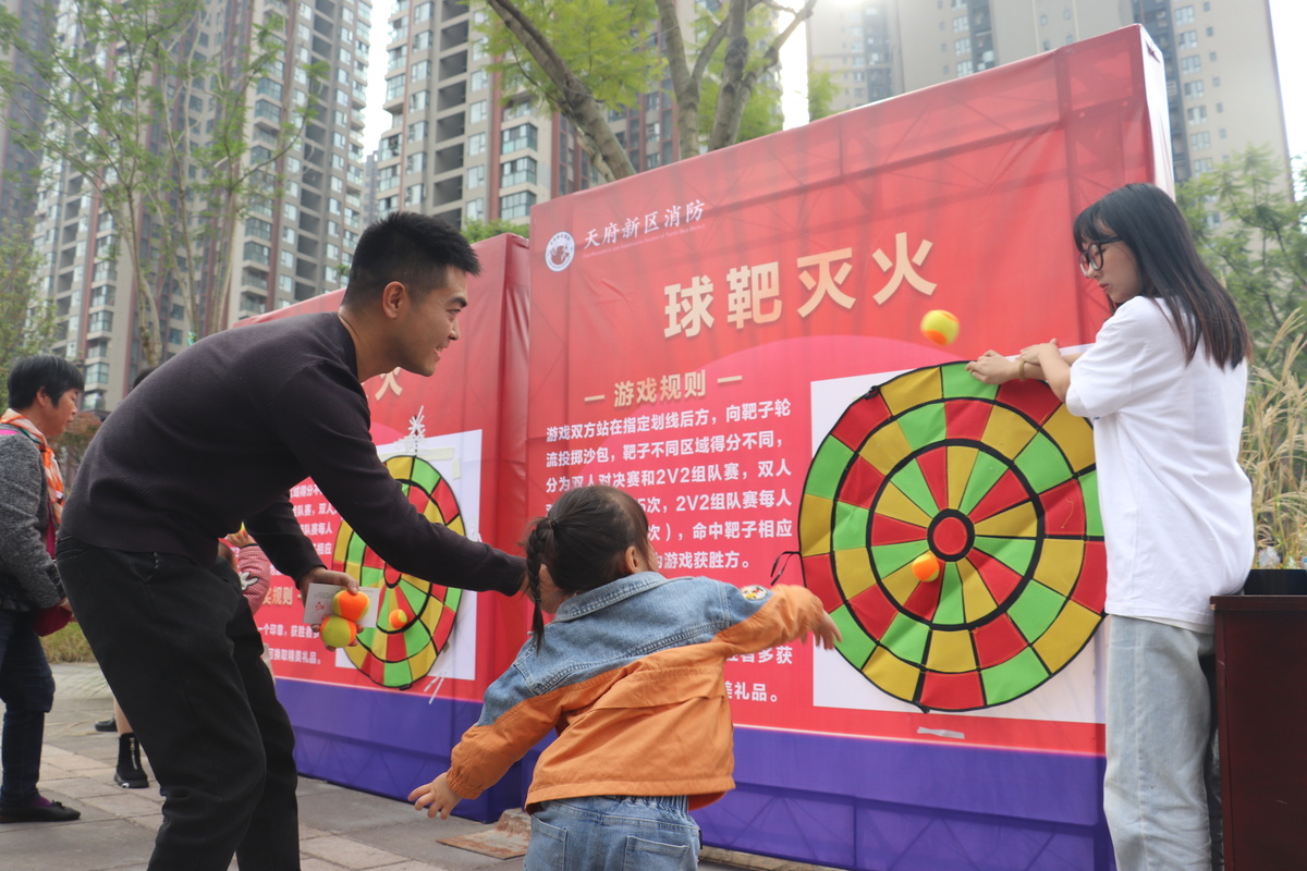 在消防趣味游园会活动现场,天府新区消防救援大队设立了消防转转乐、消防保龄球、穿越火线、火线救援、靶球救火等多个互动游戏体验区,吸引市民群众前来体验,多角度、零距离学习掌握消防知识,全面提升群众火灾预防及逃生自救能力。大队还特别邀请了民间手艺人走进消防文化公园,为现场群众做消防元素糖画、糖人、泡泡秀等,让传统手艺焕发出新的意义,这些极具消防特色的活动,赚足了现场观众的掌声和喝彩。