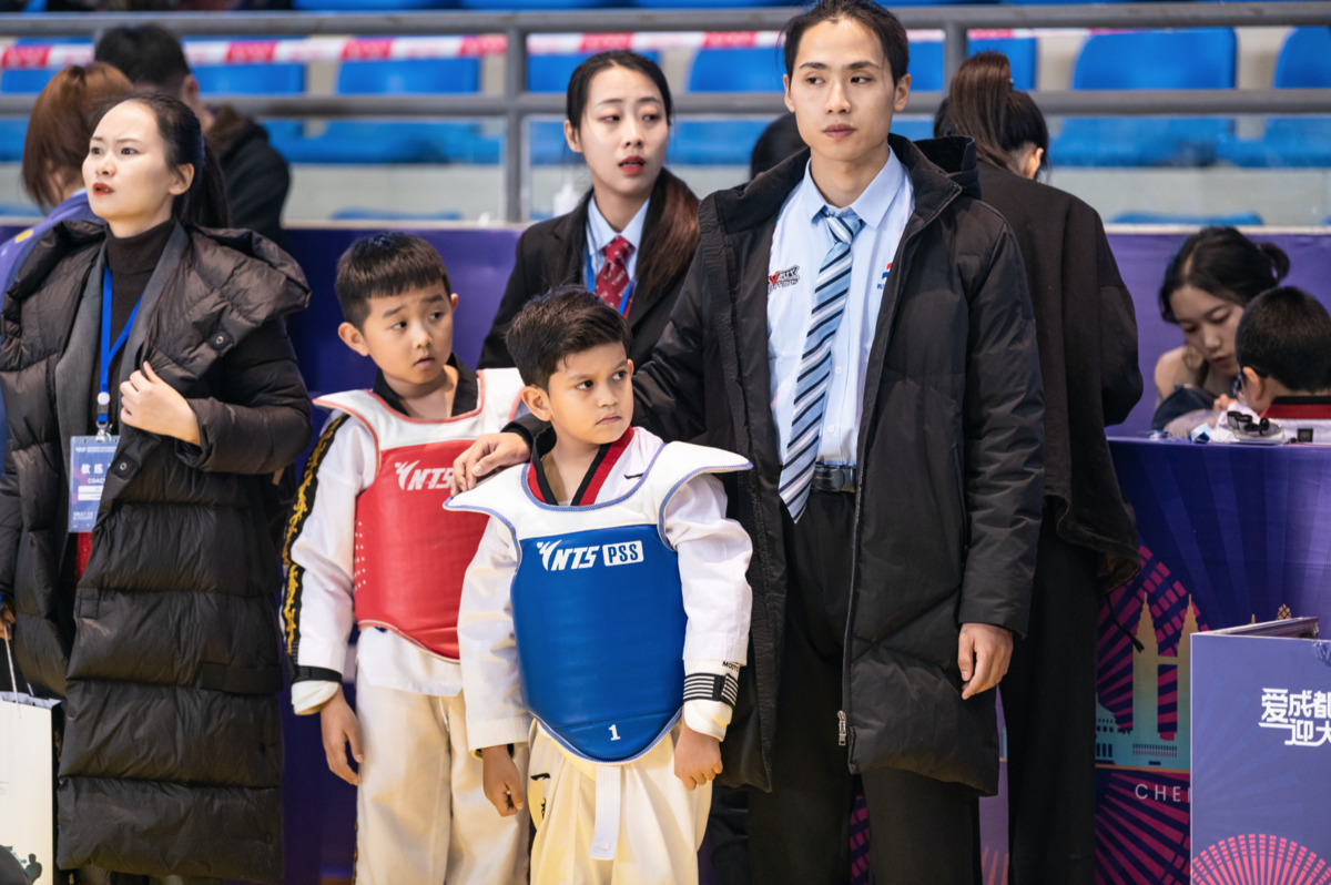 比赛场馆内,不同公斤级的选手们身着整齐的跆拳道服,腰上系着代表各自段位、颜色不一的段带,气势十足。比赛场边的三个小选手,个头才刚刚到裁判员腰部,他们自发地在角落温习着品势动作,为接下来的比赛作准备。
