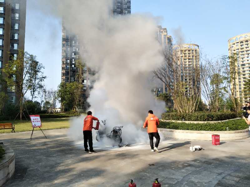 一辆黑色电动车被熊熊大火所吞噬,大片黑烟飘向空中,一块块被熔化的黑胶滴落在地上,空气中散发着难闻的焦臭气,火焰产生的热浪引得围观者连连后退。几分钟后,两名身穿橘色消防衣的男子用灭火器将其熄灭。11月7日下午,在广安承平盛世小区的空地上,消防员正在向居民们演示当电动车燃起来时,如何用灭火器科学有效地将其扑灭。而该演示也作为广安市2020年度“119”消防宣传月活动之一,在互联网平台上直播。