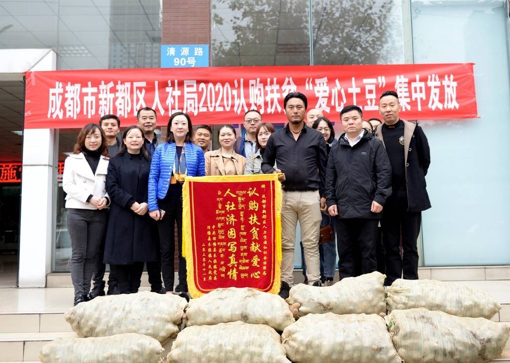 “感谢你们帮助认购3万余斤土豆……扎西德勒!”11月6日上午8点36分,“爱心土豆”车队刚在新都区人社局停车场停稳,降央吉村送上“认购扶贫献爱心、人社济困写真情”的锦旗。
