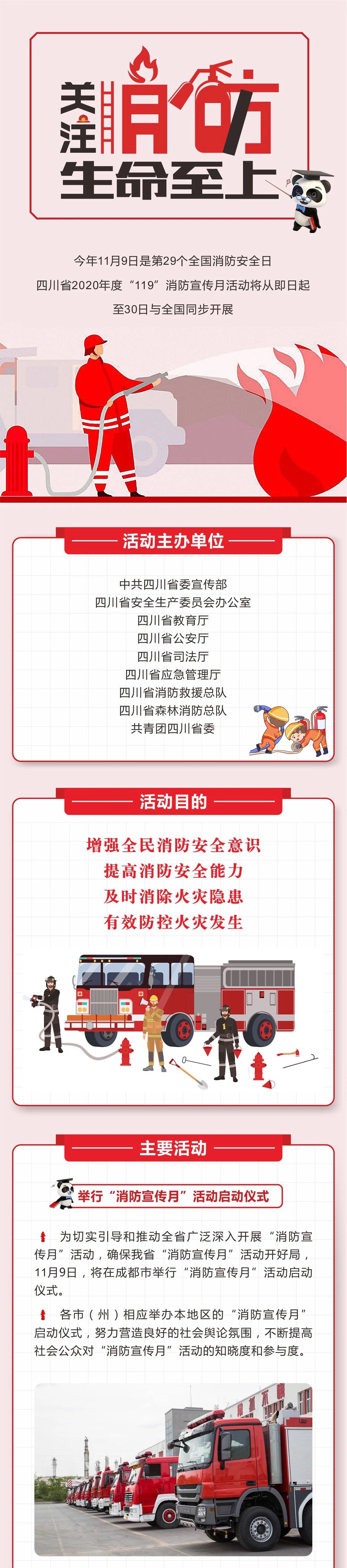 为增强全民消防安全意识,提高消防安全能力,及时消除火灾隐患,有效防控火灾发生,中共四川省委宣传部、四川省安全生产委员会办公室、四川省教育厅、四川省公安厅、四川省司法厅、四川省应急管理厅、四川省消防救援总队、四川省森林消防总队、共青团四川省委决定联合开展四川省2020年度“119" 消防宣传月活动。活动从即日起至本月30日。