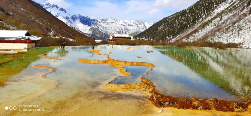 网友@听涛 “寄”来黄龙的晚秋景象,清澈的湖水倒映着天空,山水相映,相得益彰!