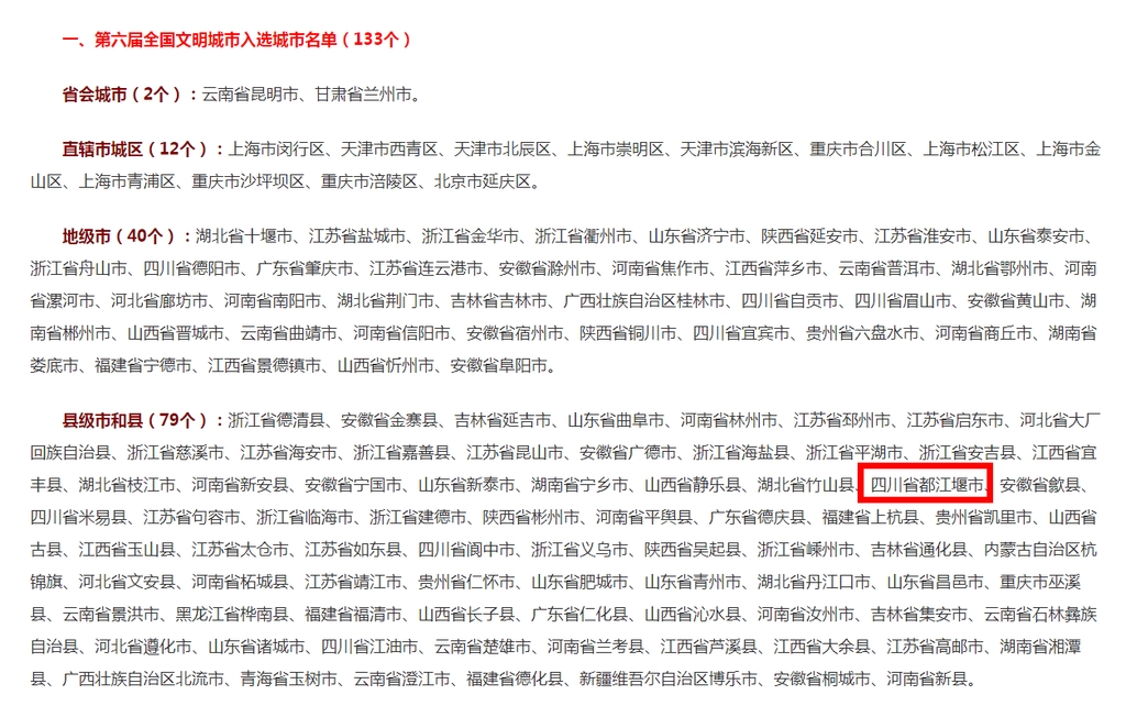 此外,四川省都江堰市成功创建第六届全国文明城市(县级市和县)。