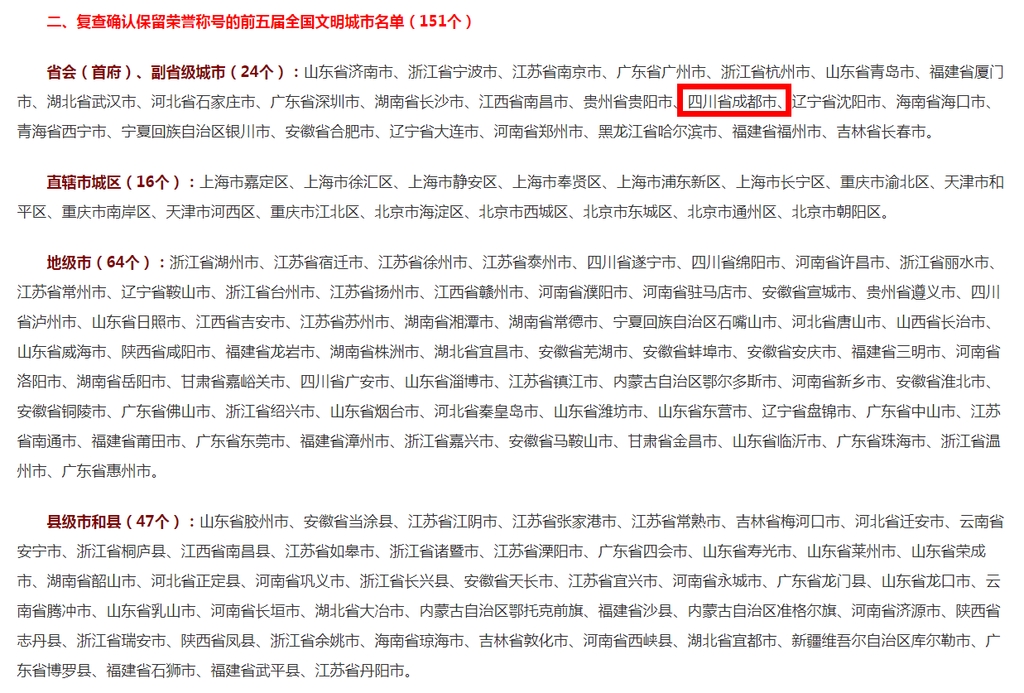 刚刚,中央文明办公布了第六届全国文明城市入选城市名单和复查确认保留荣誉称号的前五届全国文明城市名单,成都市连续五次蝉联。