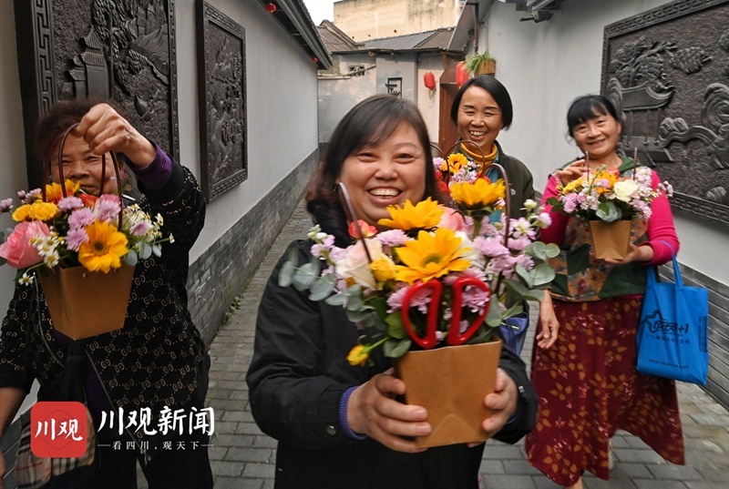 棠湖社区居民在小巷参加社区花艺活动