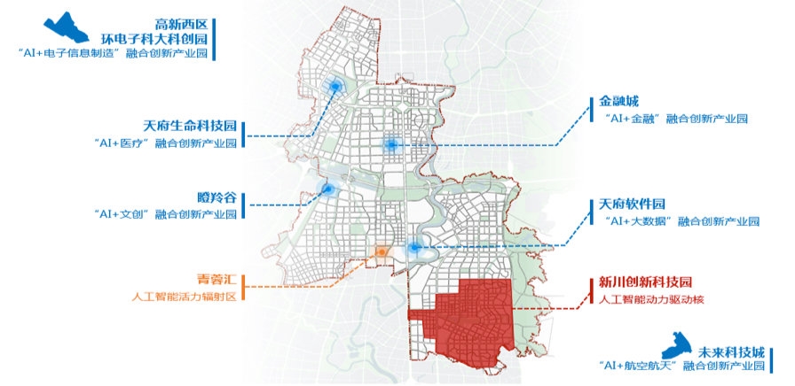 “多园”:在“中国民航科技创新示范区”“成都智能应用产业功能区”“天府智能制造产业园”“青白江欧洲产业城”等区域打造10个以上“AI+”融合应用重点园区,建设一批融合发展基础设施,赋能并支撑产业功能区产业转型升级,形成AI应用与产业发展深度融合的良好局面。