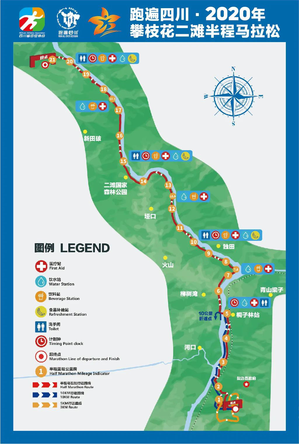 10公里健身跑:盐边县中心广场(起点)—东城街西行—盐边科学馆—西环北路北行—雅砻江边—桐梓林水电站(折返)——雅砻江边—西环北路南行—盐边科学馆——东城街东行——盐边县中心广场(终点)