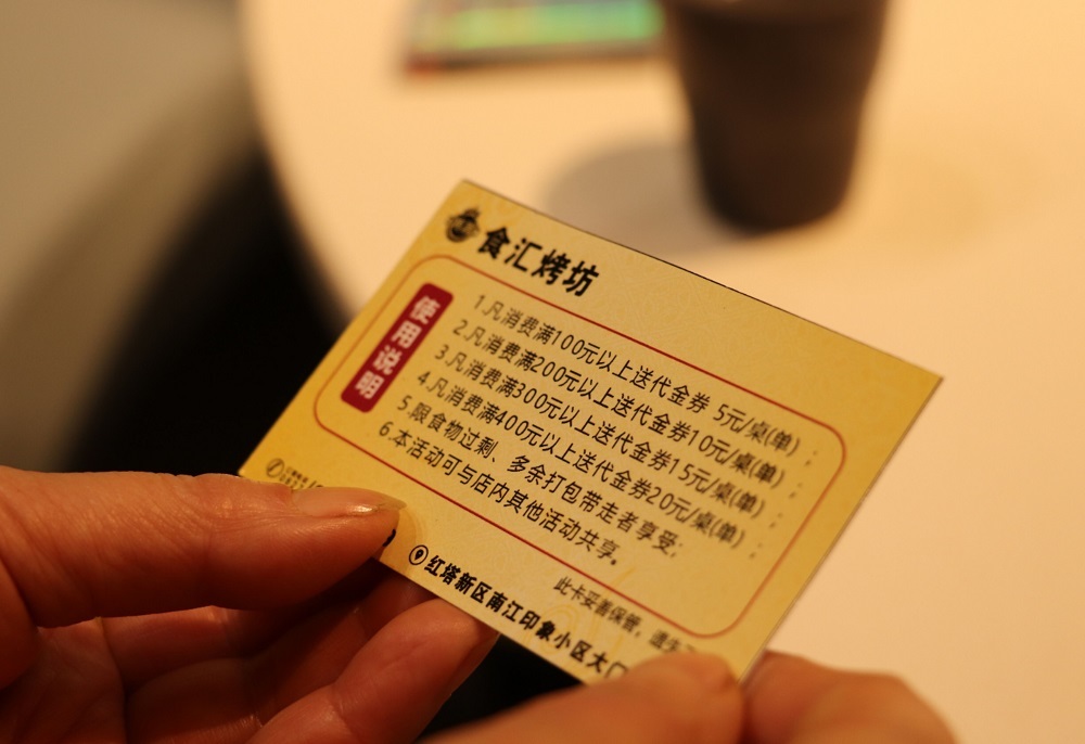 “这是2张10元的代金券,你们下次过来可以用。”11月7日晚上8点,在巴中市南江县红塔新区“食汇烤坊”,一桌客人买单完毕后,老板岳丽递上两张早早准备好的餐饮代金券,“对于就餐不浪费的顾客,他们每消费100元,我们店里都会返10元的代金券。”