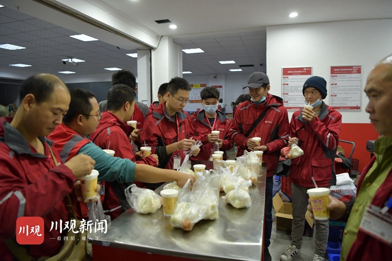 京东成都春熙路营业部的快递员们一起享用早餐福利