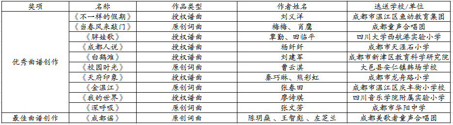 最终,经过专业音乐评审与大众评审的层层选拔,《天府印象》《当春风来敲门》《成都人说》等11首优秀童谣脱颖而出,成为优秀谱曲童谣。获奖作品中,《成都谣》荣获最佳曲谱创作,《当春风来敲门》等10首作品被评为优秀曲谱创作。这些获奖作品旋律优美动听,主题积极向上,不仅易于青少年传唱,还与成都的文化生活紧密相连,展现了大运之城的城市风貌,同时也向抗疫逆行者致敬。《成都谣》更是受到评委的一致好评,整首歌曲活泼轻快,曲调灵透柔和,音韵明亮清脆,很适合少年儿童传唱。