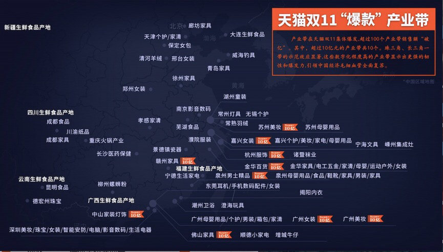 增长的背后,是全国各大产业带的支撑。11月12日,天猫发布的《双十一产业带“回血”报告》显示,产业带天猫“双十一”期间的总体成交额同比去年增加13.7倍。