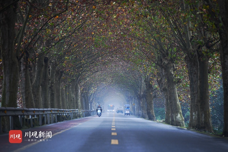 成都市温江区温玉路两旁的梧桐树持续10多公里绵延不绝,远远望去仿佛一条时空隧道。11月12日记者在温玉路看到,道路两旁的梧桐树全黄了叶子,这条“隧道”迎来最美季节。微风一起,片片落叶在空中翩翩起舞,为金色“隧道”增添着一份诗意。